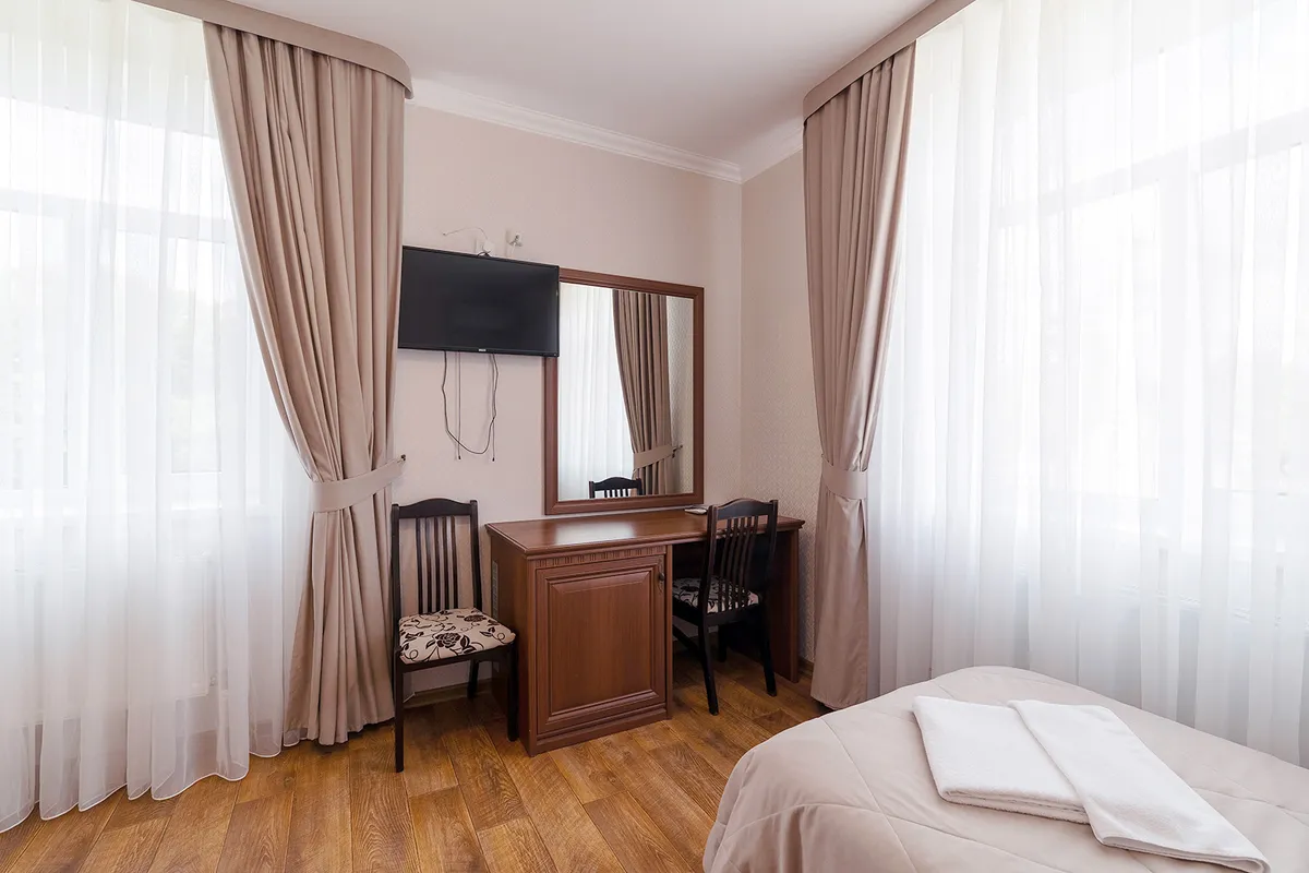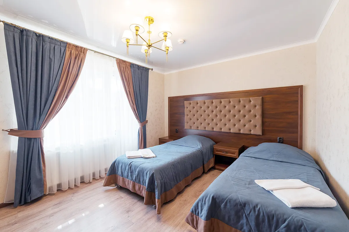 Корпус №1№4, №5 (2-х этажные) 2-х,3-х местные номера однокомнатные и 2-х местные двухкомнатные (максимально 4 чел.) с удобствами, оснащены мебелью (односпальная или двухспальные кровати, столы, стулья), телевизор, холодильник.
