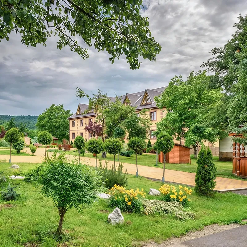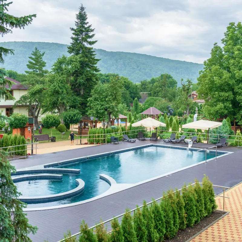 Бассейн, беседки, мангалы, спортивная площадка, сауна, джакузи, комната отдыха, настольный теннис, бильярд, кафе, есть спуск к реке и небольшой пляж. Корпуса расположены в фруктовом саду. Рядом с турбазой — интереснейшие экскурсионные объекты и маршруты, доступные неподготовленным туристам любого возраста.
